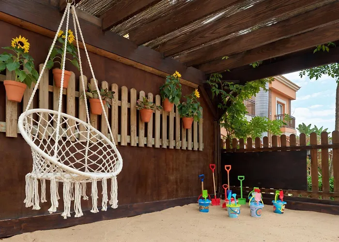 A propriedade oferece solário e jardim juntamente com portões de segurança para bebê, cadeiras para crianças e berços para crianças.